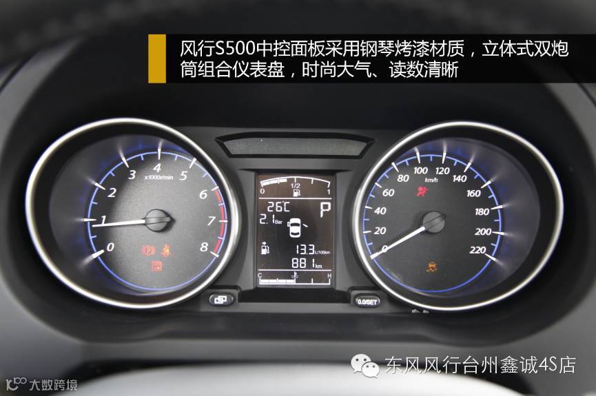 风行S500中控面板采用钢琴烤漆材质,质感更加细腻,将时尚与典雅气质完美呈现。立体式双炮筒组合仪表盘,具备时尚大气品质的同时,还可显示水温、单程里程、总里程、胎压、轮胎温度、油量、车门未关提醒、档位状态、平均油耗共计9项行车信息,清晰易读,为行车安全带来更多保障。