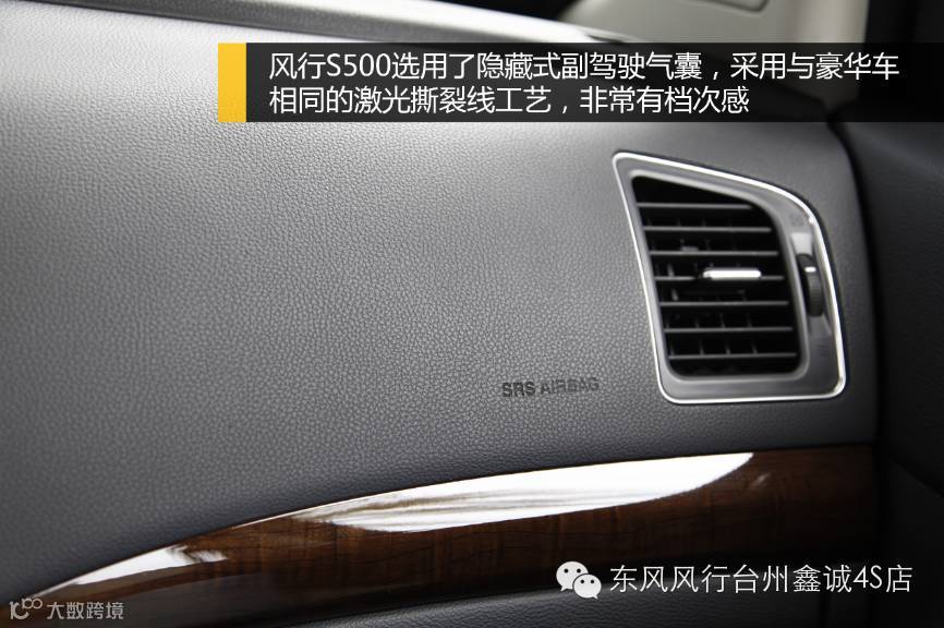 为了进一步提升内饰档次和质感,风行S500还选用了隐藏式副驾驶气囊,采用与豪华车相同的激光撕裂线工艺,将副气囊盖分封线隐藏在仪表台面板下,这样的无缝隙设计不仅更加美观大方,也可以杜绝气囊盖板翘起现象,确保整体内饰风格的和谐统一。