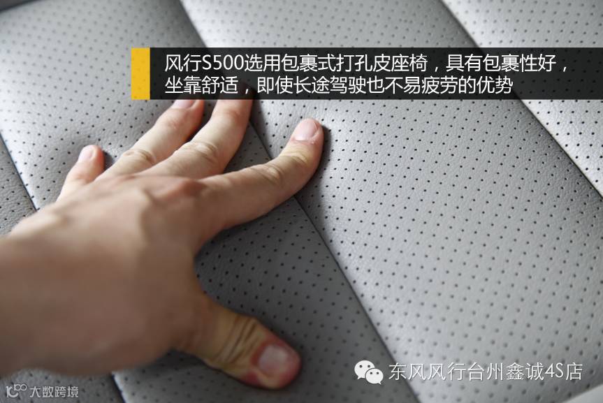 配合双色内饰,座椅也有两种色彩选择,亮色优雅、黑色酷动,可带来和谐大气的视觉感受。风行S500还选用包裹式打孔皮座椅,具有包裹性好,坐靠舒适,即使长途驾驶也不易疲劳。