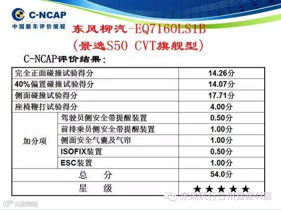 6月29日,中国汽车技术研究中心公布了2015年最新一批车型C-NCAP评价结果,东风风行景逸S50以总分54分荣获C-NCAP五星安全认证。此次碰撞试验中,景逸S50正面、正面偏置、侧面和座椅鞭打四项碰撞成绩优异,展现了东风风行景逸S50作为“高品质越级家轿”在安全性能上的超凡实力。