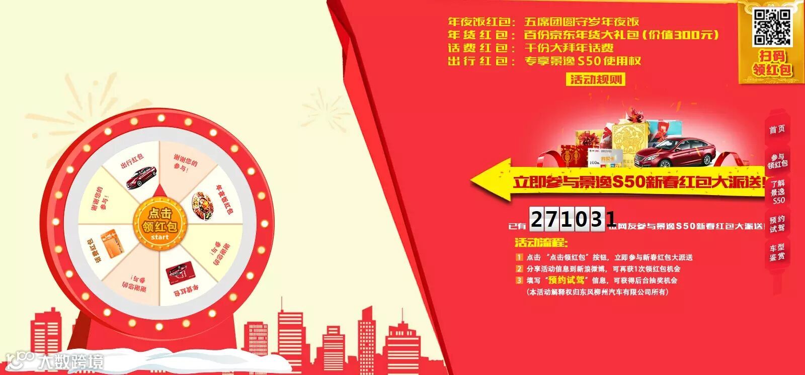 景逸S50让红包飞,点击或扫码参与来拼抢红包,手机端更方便快捷,仅需通过手机微信扫码参与,还能拉上亲朋好友,玩转大转盘。出行红包、年夜饭红包、话费红包等奖品赢不停,活动结束后,有超过27万的网友参与。