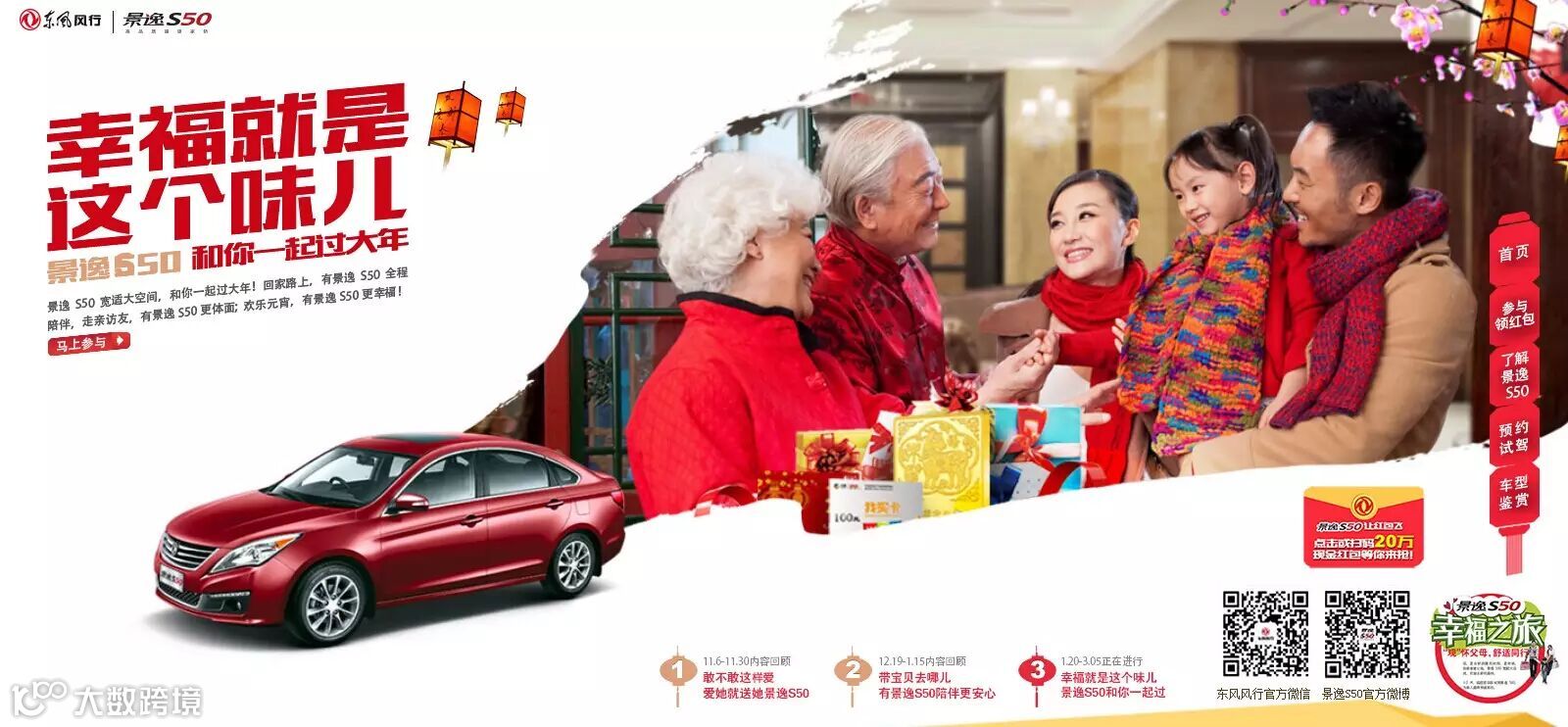 “春节年夜饭”项目是风行景逸S50新春红包大派送活动,用户分享活动和报名试驾获得参与机会,赢取景逸S50使用权及新年大礼。同时,通过手机微信扫码参与——父母领红包互动,刺激消费者参与,提高移动端集客线索量。活动上线后引起了广泛的关注,并刺激了广大消费者一同参与,风行景逸S50进一步传达了“幸福,就是和你在一起”的品牌理念。