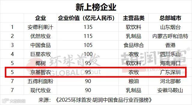 12月19日由胡润研究院发布的《2025胡润中国食品行业百强榜》中,京基智农作为新上榜企业,与安德利果汁、优然牧业、中国食品、巨星农牧、椰树、五得利面粉、现代牧业等七家公司一同进入榜单。
