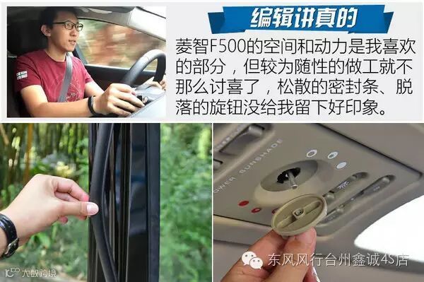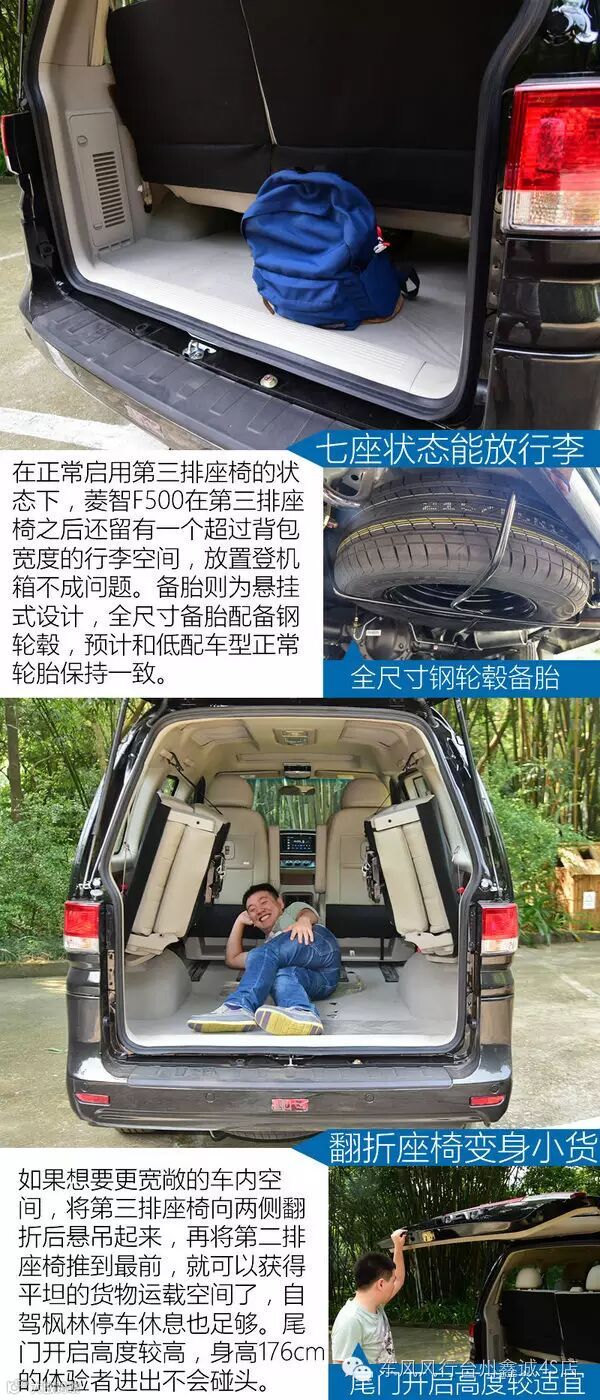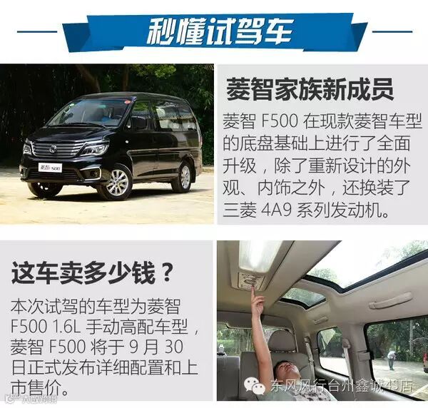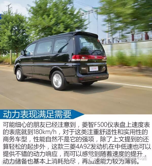 总结:车的产品实力和品质需要放到特定的价格区间中来评定,在7-10万元商务MPV细分市场,菱智F500可以算得上是一匹黑马。从三菱SPACE GEAR车型继承而来的出色基因还在发挥效能,而高效的动力系统、宽敞通透的内部空间以及全新的外观内饰设计都令这款新车的产品实力获得提升。如果您正准备拿10万元预算来选购一款高端大气上档次而又经济实用的商务MPV车型,我建议您等等将在9月30日正式发布上市售价的菱智F500。当然就像上面说的,“车无完车”,我也期待着厂家能够在细节部分进一步优化,不给用户留下遗憾。