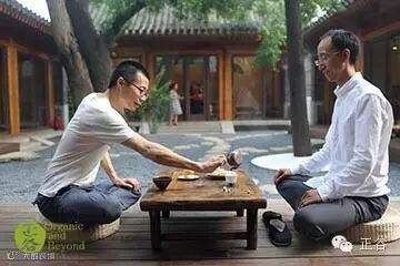 大暑过后,立秋未至,正是最炎热的时节,空气中蒸腾着令人难耐的暑热。长安街上满眼都是高大的写字楼群,在灰蒙蒙的空气里看得人有些心浮气躁。然而往南一拐,稍走几步便到了文昌胡同,黄色大门虚掩的小院赫然出现在眼前,进得门来,耳边车水马龙的市声一下子听不见了。深蓝色和白色的石子细碎地铺满了地面,高大的树干和茂密的枝叶为小院遮出郁郁的荫凉。小院里正在准备一场别样有机家宴,这场以中秋为名义的晚宴,其实离中秋还有一个月,说是一场借中秋之名邀好友叙旧聊天的家宴,倒是更为合适。"尤为特别的一点,还是今天的食材",今天宴会的主人徐新说。徐新是正谷公司的执行总裁,正坐在茶席前一边以流畅的动作泡着茶,一边与客人聊天。正谷是一家有机农业企业,今晚所用的食材就来自他们的标准农场。家宴还有一个特别之处,就是今晚的厨师。