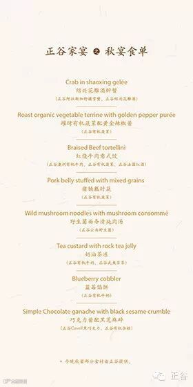 看了一眼今天的食单:绍兴花雕雪蟹冻、罐烤有机蔬菜卷、蔬汁有机牛肉饺、有机时蔬肉瓤汇、野生菌汤汁面、岩茶奶冻、蓝莓燕麦派、黑芝麻酥巧克力慕斯。我们有点吃惊中秋宴的食单竟完全是西餐的形式,而且光看菜名,有点难以想象每道菜的样子。罗朗说,这些菜都有他自己看到正谷的食材后才有的创意,没有现成的菜谱做法。