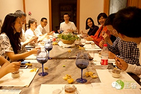 海阔天空一番交谈之后送上了正谷月饼。"今年的月饼从饼皮到馅料,都是我们自己挑的。选用了咱们的白芸豆豆粉做成的桃山皮来代替糖浆皮,低糖少油,不腻口。"张建伟笑着把月饼递到每个人手里,"澳洲进口的牛肉、瑞士的巧克力、加州的干果,再配上绿豆蓉做了三种口味,你们看看喜欢哪种?"咬一口月饼,牛肉馅的充满细腻而劲道的口感,干果杂粮馅有谷物特有的健康香气,而巧克力馅的颗粒甜而不腻,真有点难以取舍。吃着代表团圆的月饼,中秋的感觉仿佛一下子提前到来了。大家又聊了几句老友初识时的情景,忽而都有点感慨万千。"一晃都多少年了。不过还能聚在一起这么开心地聊天吃饭,真该庆祝。"感叹中是酒杯碰在一起的声音。