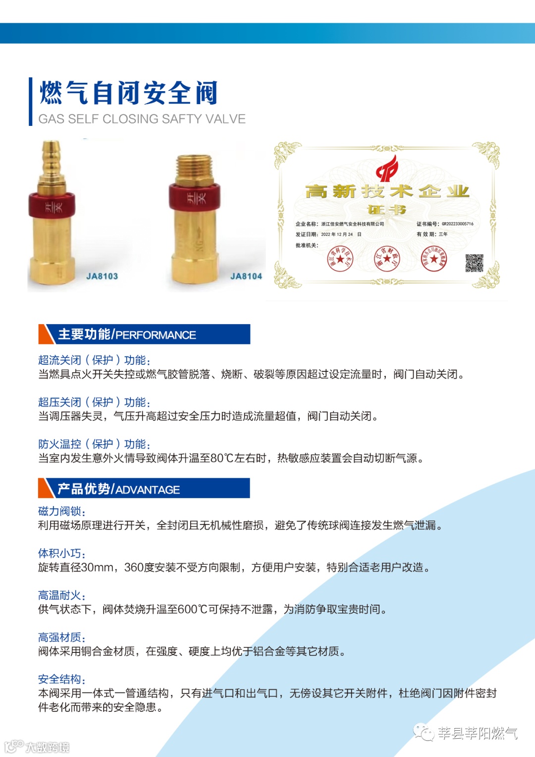 或管道压力过低、过高、及流量异常时,燃气自闭阀能不借助任何外部动力,也无需用电,立即自行关阀(阀门吸进去),阻止燃气输出。