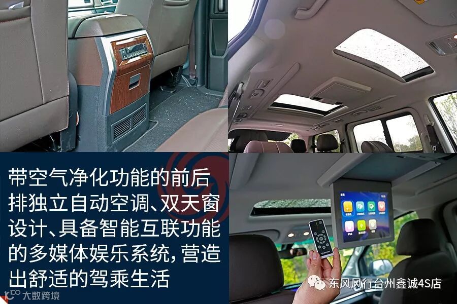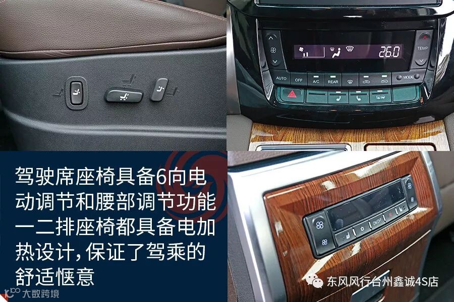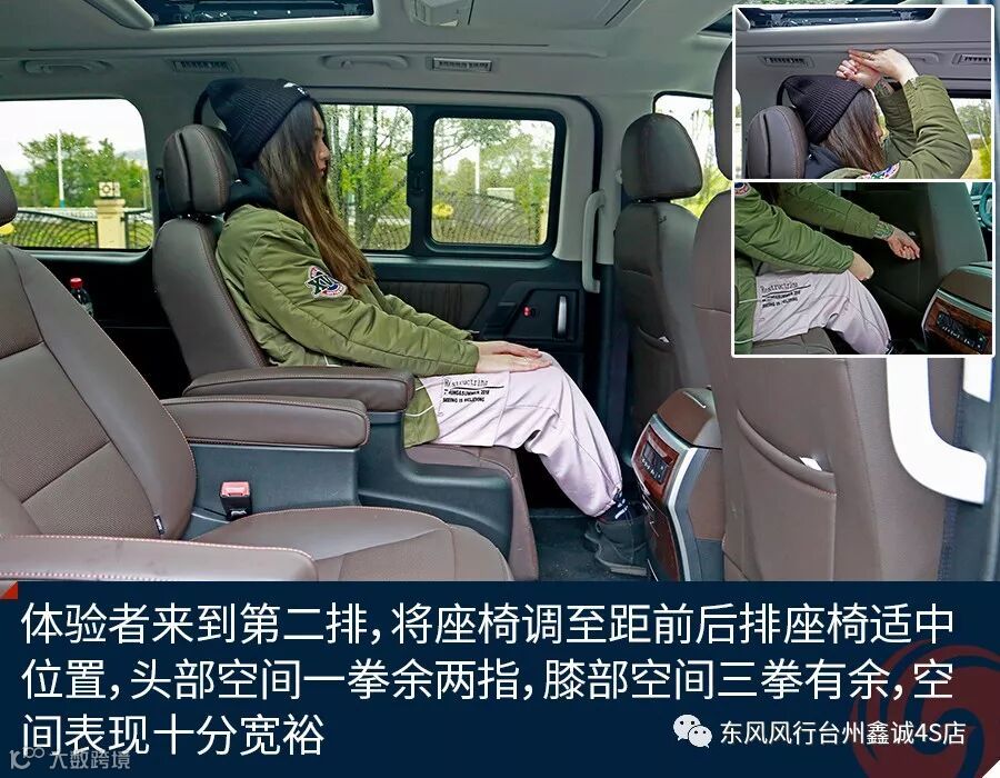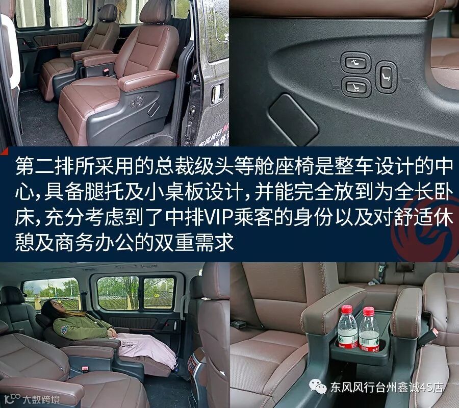 作为新车的最大亮点之一,风行M7的座椅设计非常值得称赞。其驾驶席具备6向电动调节和腰部调节功能,一二排座椅都具备电加热设计,保证了驾乘的舒适惬意。而第二排所采用的总裁级头等舱座椅是整车设计的中心,具备腿托及小桌板设计,并能完全放到为全长卧床,充分考虑到了中排VIP乘客的身份以及对舒适休憩及商务办公的双重需求。