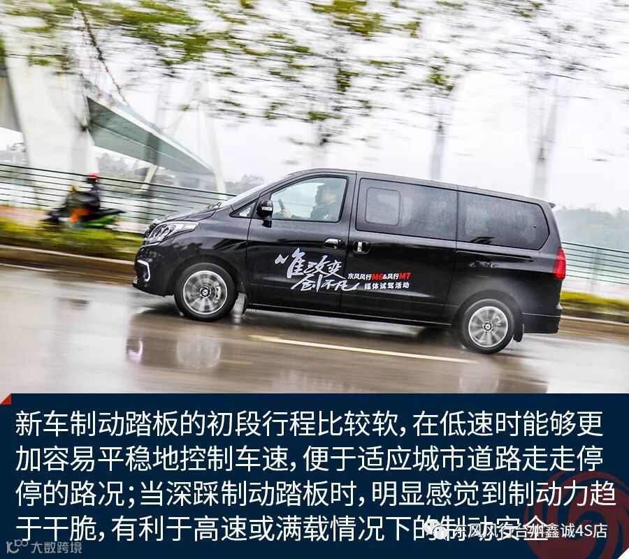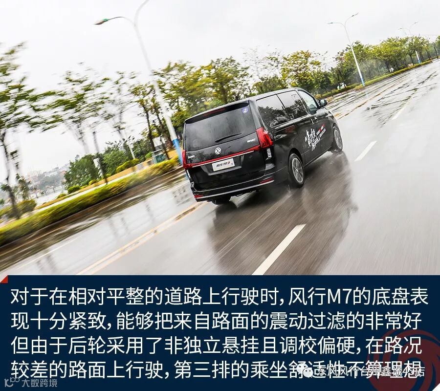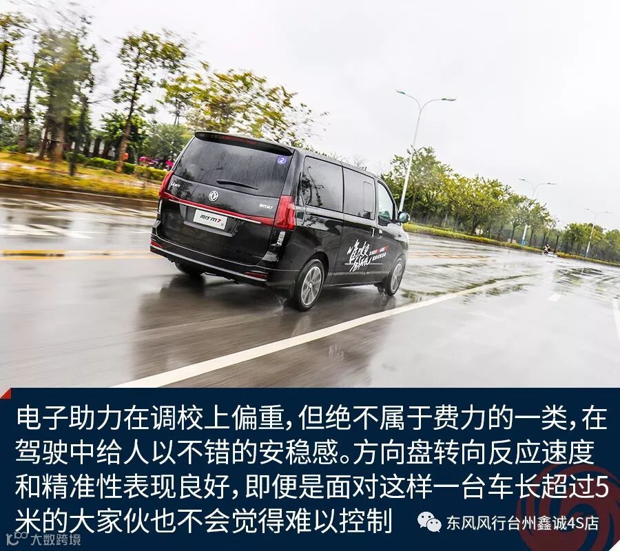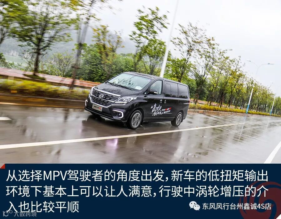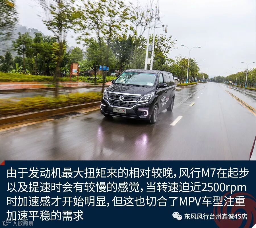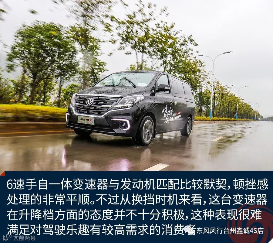 关于驾驶方面,由于发动机最大扭矩来的相对较晚,东风风行M7在起步以及提速时会有较慢的感觉,当转速迫近2500rpm时加速感才开始明显,但这也切合了MPV车型注重加速平稳的需求。从选择MPV驾驶者的角度出发,新车的低扭矩输出环境下基本上可以让人满意,行驶中涡轮增压的介入也比较平顺。在高速行驶情境下,140千瓦的最大功率输出保证了新车可以有足够充沛的稳定动力。