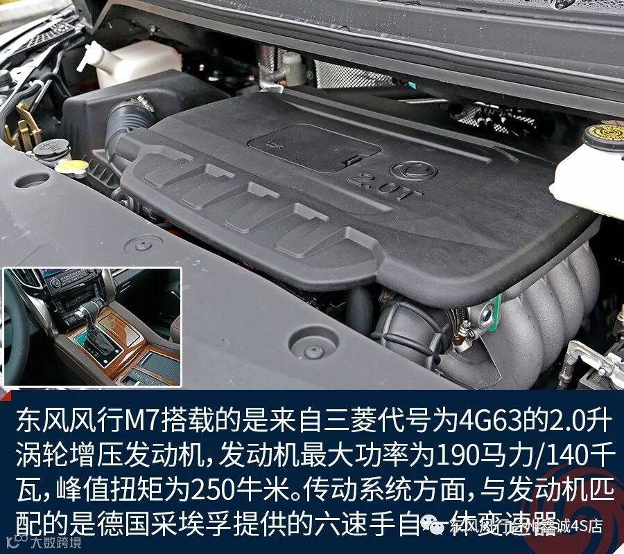 动力方面,东风风行M7搭载的是来自三菱代号为4G63的2.0升涡轮增压发动机,发动机最大功率为190马力/140千瓦,峰值扭矩为250牛米。传动系统方面,与发动机匹配的是德国采埃孚提供的六速手自一体变速器。