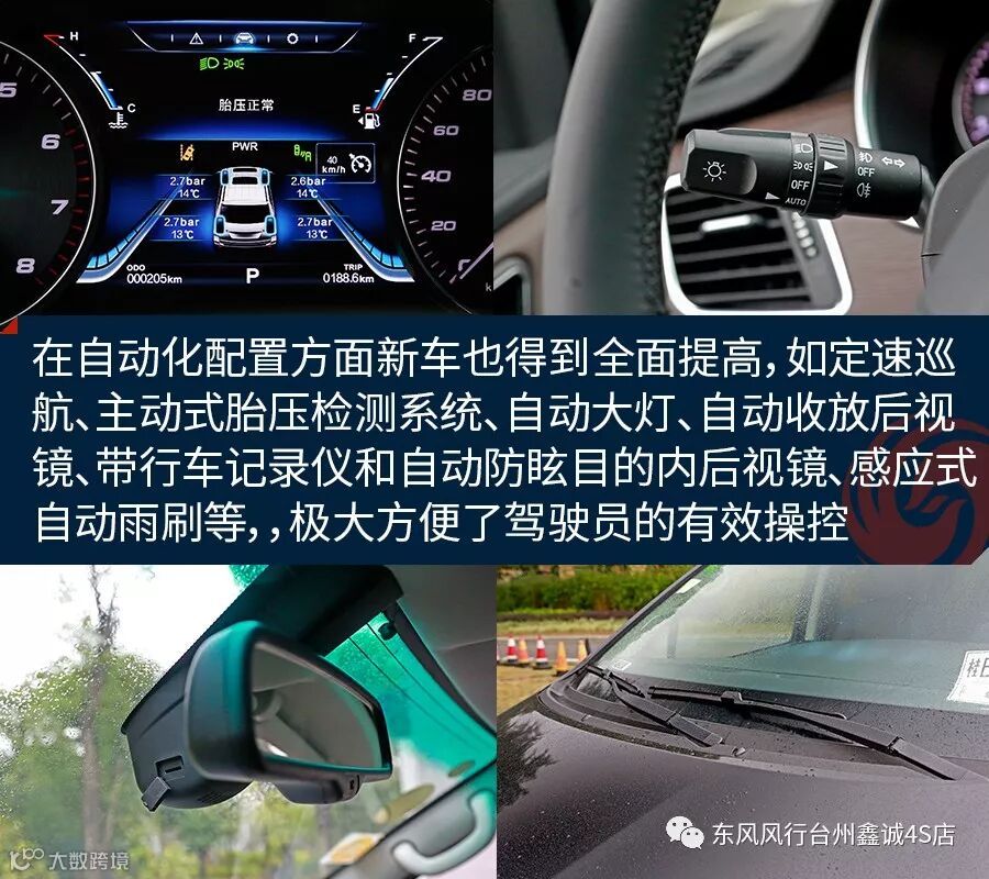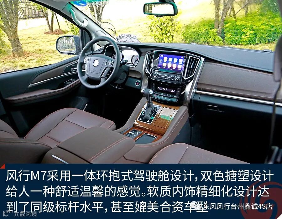 内饰方面,风行M7采用了一体环抱式驾驶舱设计,双色搪塑设计搭配整车氛围灯,给人一种舒适温馨的感觉。软质内饰精细化设计达到了同级别标杆水平,甚至可以与合资车型媲美。配置方面,新车提供了无钥匙进入、一键启动、盲区监测、360度全景影像、车道偏离预警、12颗雷达探头、定速巡航系统、电子手刹和自动驻车等功能。此外,新车还配备多项自动化配置,如主动式胎压检测系统、自动大灯、自动收放后视镜、行车记录仪和自动防眩目内后视镜、感应式自动雨刷等。