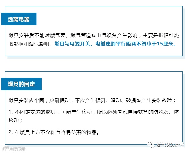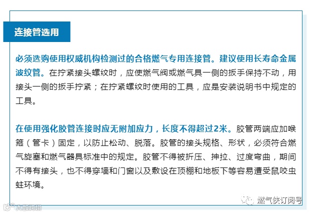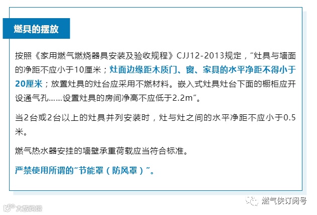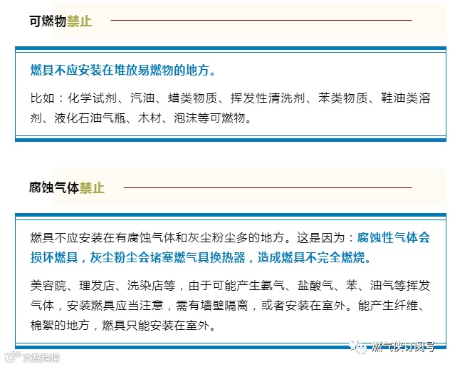 燃气灶具、热水器等燃具安装的环境,并不是可以随意找个顺眼的位置就可以的,包括它的连接管等配件的选用,都有很严格的技术标准要求。