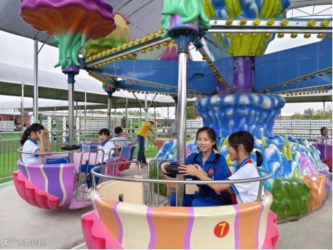 形似水母的逍遥水母游乐设施,在旋转上升与下降的过程中,孩子们如同在海洋中自由飘荡的水母,体验到轻松愉悦的游乐感受。