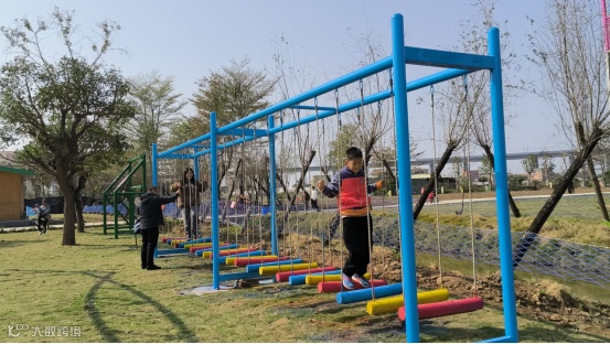 由各种吊桩连接而成的挑战路径,孩子们需要在晃动的吊桩上保持平衡,一步步跨越前行。