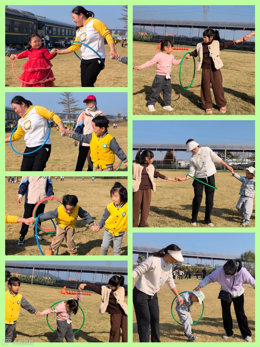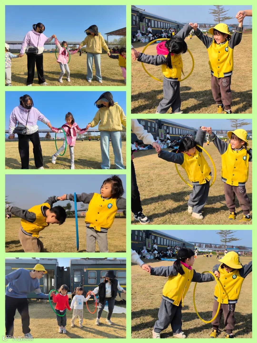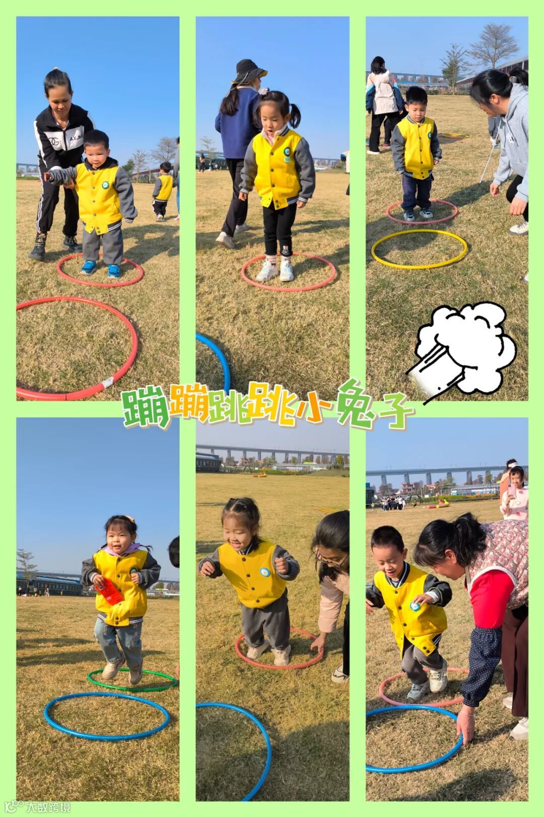 跳圈圈时,小朋友们化身为灵动俏皮的小精灵,在一个接着一个的圈圈间轻盈跳跃,家长们把圈圈一直拿到小朋友的前面,耐心引导,每一次成功的跳跃都伴随着欢快的笑声,温馨的画面让人心里暖融融的