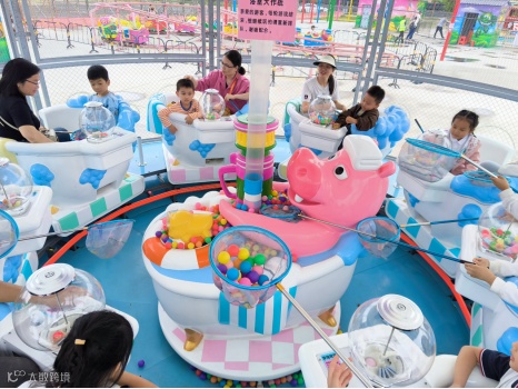 可爱的潜艇造型喷球车,孩子们在车内操控着喷球装置,将彩色的小球喷射向四周。
