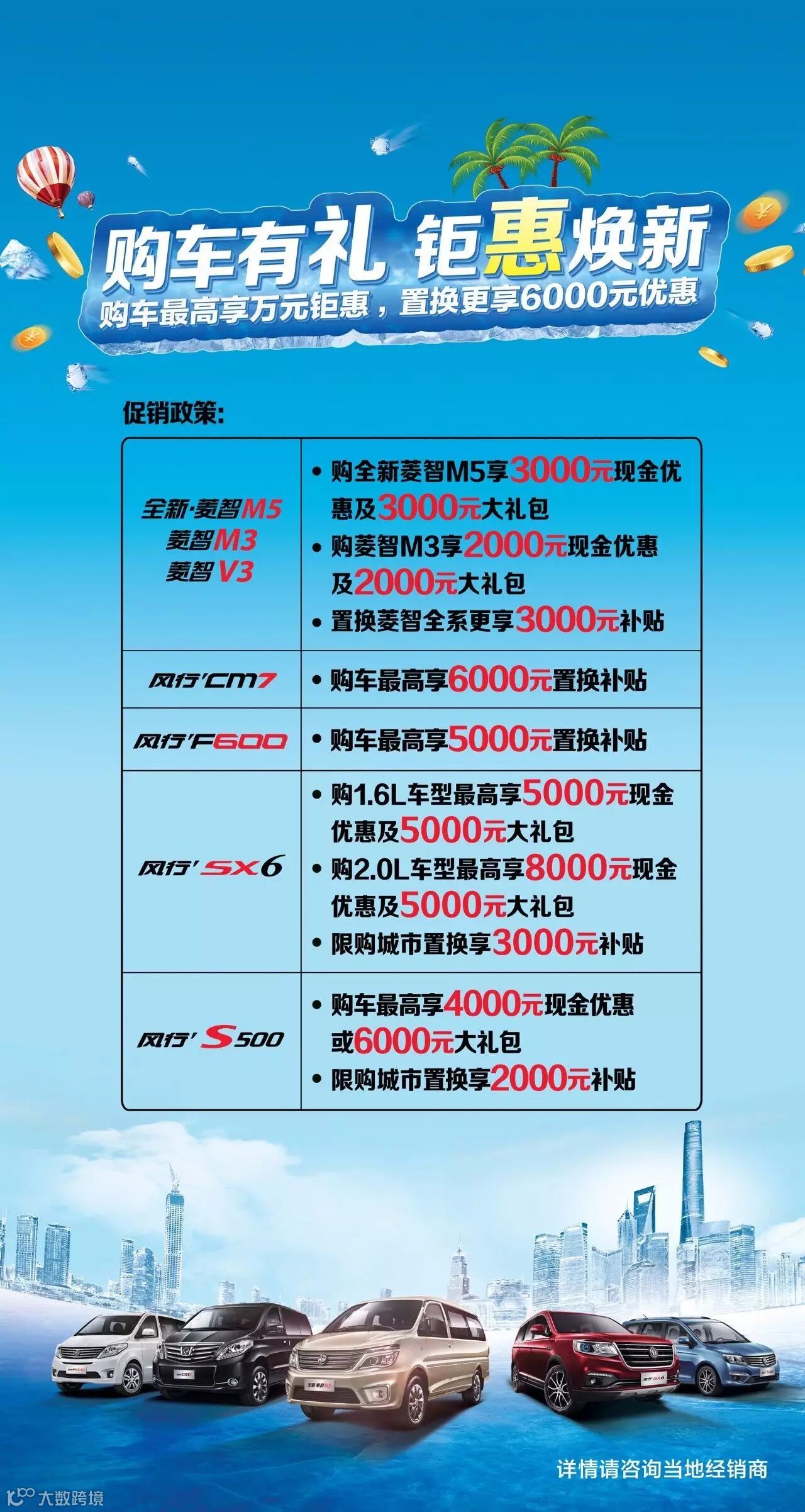 即日起,购风行SX6和风行S500,最高可享8000元现金优惠以及5000元礼包,限购城市置换风行7座家用车,最高还可享受3000元置换补贴。