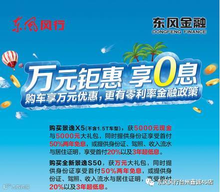 对了,东风风行旗下除了全新景逸X5有如此给力的优惠政策以外,轿车产品线上的全新景逸S50同样也有双重惊喜:从即日起至9月底,消费者凡是购买全新景逸S50全系车型其中任何一款,就可以在获得万元大礼包,同时提供身份证则可享受首付50%两年免息,或者提供身份证、驾照、收入流水与居住证明,就能享受首付20%以及3年超低息,这样的购车政策,可让消费者轻轻松松将全新景逸S50“贷”回家。