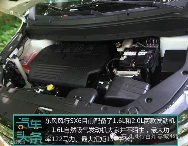 动力方面,风行SX6目前配备了1.6L和2.0L两款发动机,1.6L自然吸气发动机大家并不陌生,在风行S500、景逸XV等多款车型上使用过。最大功率122马力、最大扭矩151牛米。传动方面采用了CVT变速箱。2.0L发动机是由东风和PSA集团倾力打造,原型机是PSA的EW10发动机,东风体系重新命名为DFMB20发动机,其最大功率145马力,最大扭矩200牛米。传动方面采用了5MT变速箱。根据东风大自主战略,这款发动机从神龙公司转移到柳汽生产。