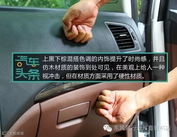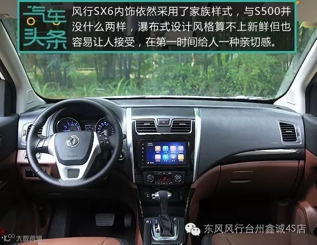 风行SX6内饰方面依然采用了家族式设计理念,与S500并没有什么两样,瀑布式设计风格算不上新鲜但也容易让人接受,在第一时间给人一种亲切感。上黑下棕混搭色调提升了时尚感,并且仿木材质的装饰到处可见,在美观上给人一种视冲击。多功能方向盘是东风风行的家族式风格,比较粗壮握感十足我还是比较喜欢这样的设计。家族式炮筒仪表盘采用了蓝红色搭配显示效果较为清晰,中间的行车电脑黑白搭配也没有什么惊喜。