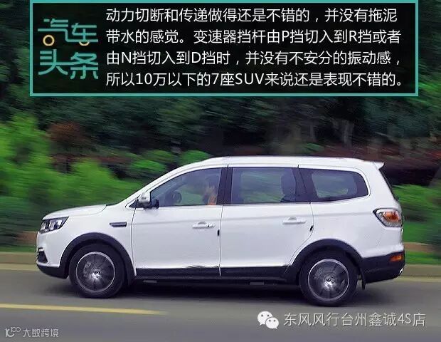风行SX6对动力的切断和传递做得还是不错的,并没有拖泥带水的感觉。变速器挡杆由P挡切入到R挡或者由N挡切入到D挡时,并没有不安分的振动感,所以对于10万以下的7座SUV来说还是表现不错的。