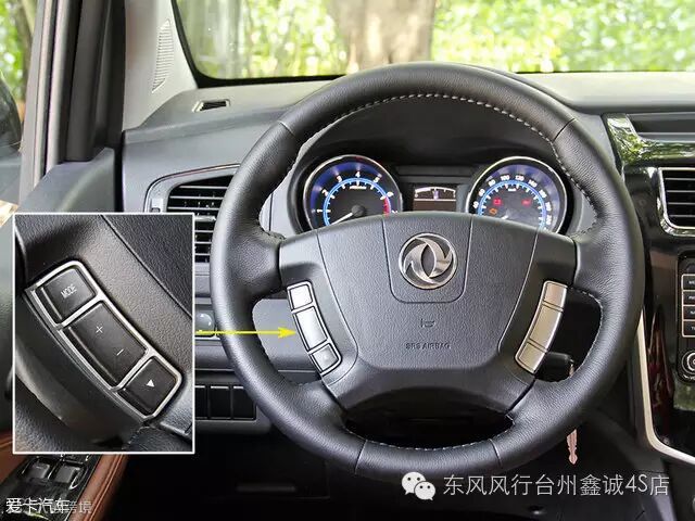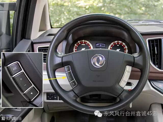 四辐式真皮方向盘应该是将CM7的方向盘直接拿过来用了,左侧的多功能按键用来切换多媒体音源以及控制音量大小。