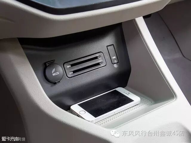 中控台底部的储物格可放置手机等物品,这里还有点烟器、卡槽、AV IN视频输入端口以及USB等便利配置。