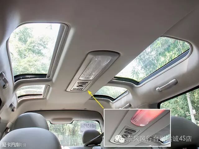 F500最赞的地方就是车顶天窗了,五个独立的天窗服务于不同位置的乘客,使得车内的空间感受要比实际空间大了不少。后排的四个天窗还带有独立控制的遮阳帘,可通过车灯的控制键来操作。