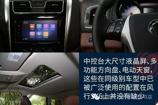 对于风行SX6来说,它的配置表现完全属于同级别车型的平均水平。电动天窗、真皮座椅、中控台大尺寸液晶屏等这些都有,如果你要说想要找一些具有爆点的配置,那不好意思,它毕竟是一款10万元区间的家用车,爆点配置请你去30万元车型上找,它这里没有。