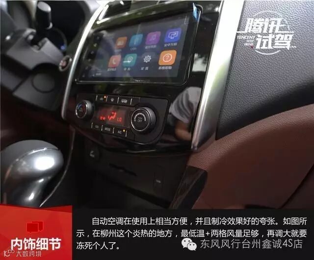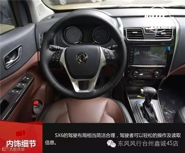 风行SX6的中控台使用了传统的布局,造型设计简单直观,上手毫无压力。双炮筒式的仪表较为动感,配合多媒体8寸可触摸液晶屏,营造出相当主流的驾驶氛围。真皮多功能方向盘手感舒适,方向盘位置调节功能保证了不同驾驶者可以区分设定,间接提升了行车的安全性。车内大量银色和高亮镀铬装饰条点缀提升品质感。此外,自动空调、电动天窗、倒车影像等在风行SX6上也均有配备。
