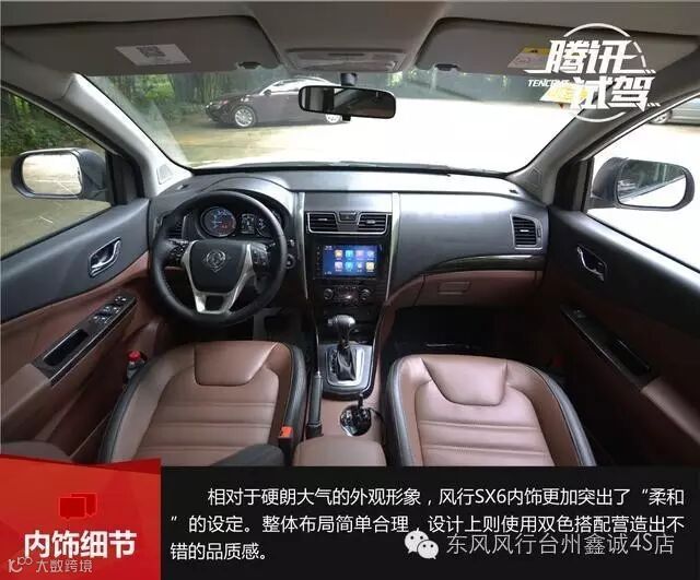 风行SX6无论从内饰布局、色彩搭配,还是细节处理都体现出这款家用SUV的温馨、舒适。对于家用车来说,乘坐感受是相当重要的考核指标,能最直接带来舒适体验的就是座椅了。风行SX6选用了皮质座椅,材质比较柔软,全新开发的座椅造型不仅观感比较高级,包裹性也更强,更符合人体工程学。配色上采用了棕色双拼和米色两种不同的设计,以棕色双拼为例,在这个级别市场中算得上是卖相出众。
