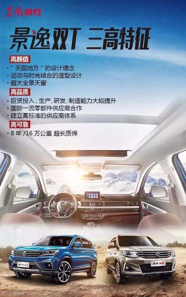 高颜值:全新景逸X5、景逸X6在设计上采用了“天圆地方”的设计理念,从而打造出独具非凡气质的前脸造型!超大全景天窗的设计,更是让阳光生活触手可及!