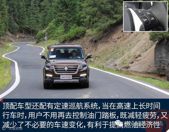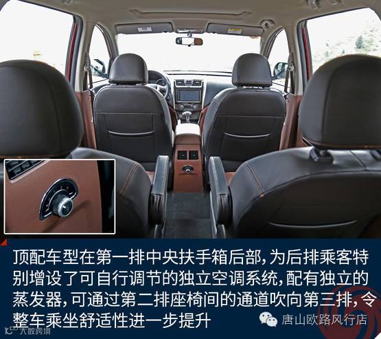 本次我所试驾车型为1.6L CVT尊享型车型,虽然风行SX6也提供了2.0升排量车型,但从配置来看,本次试驾的1.6L CVT尊享型才是全系车型中的顶配车型,当然,这一点从售价表现上也有体现。新车配备了自动大灯、360°全景影像、KESSY无钥匙进入+一键启动系统、定速巡航、倒车雷达、胎压监测等配置。另外,顶配车型在第一排中央扶手箱后部,为后排乘客特别增设了可自行调节的独立空调系统,配有独立的蒸发器,可通过第二排座椅间的通道吹向第三排,令整车乘坐舒适性进一步提升。