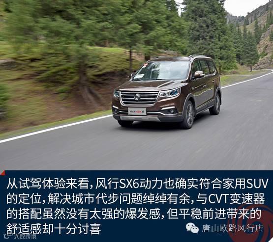 风行SX6搭载的是1.6升或2.0升发动机,分别来自于三菱和PSA。其中1.6升发动机最大功率90千瓦,最大扭矩151牛·米;2.0升发动机最大功率108千瓦,最大扭矩200牛·米。与这两款发动机配合的则是来自于格特拉克的手动变速器(1.6升车型和2.0升车型)和来自于邦奇的CVT变速器(1.6升车型)。