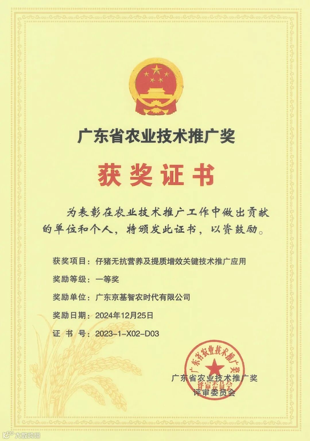 京基智农近日,广东省农业农村厅为广东省农业科学院动物科学研究所主导、京基智农参与的“仔猪无抗营养及提质增效关键技术推广应用”项目颁发“广东省农业技术推广奖一等奖”荣誉证书。