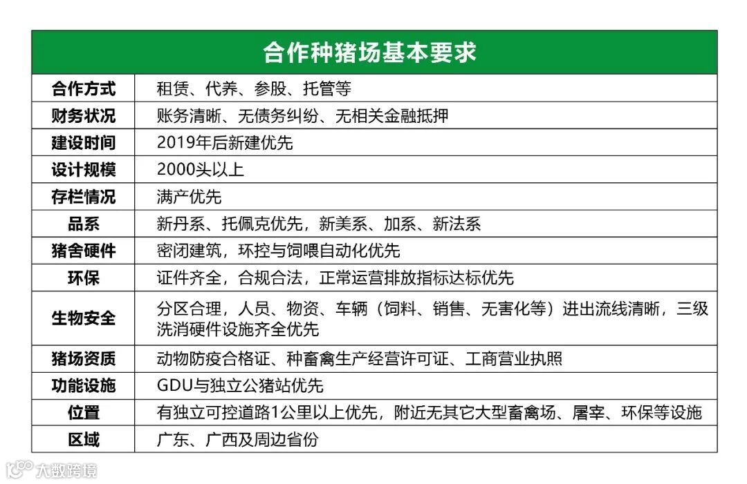 具备合法经营资质,证件齐全;满足环保合法合规的要求;栏舍科学高效;地理位置交通便利;合作模式灵活(包括但不限于租赁、代养、参股、托管等);种猪品种优良,生产性能稳定,行业口碑良好。具体如下: