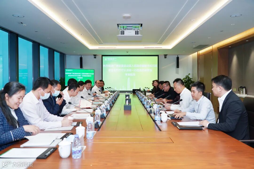 11月9日下午,广西壮族自治区人民政府副秘书长邝兵,自治区党委农办主任、农业农村厅党组书记、厅长刘俊一行莅临京基智农深圳总部考察指导并举行座谈会。京基智农总裁巴根、副总裁蔡新平、副总裁兼财务总监黄益武、副总裁谢永东等出席接待。