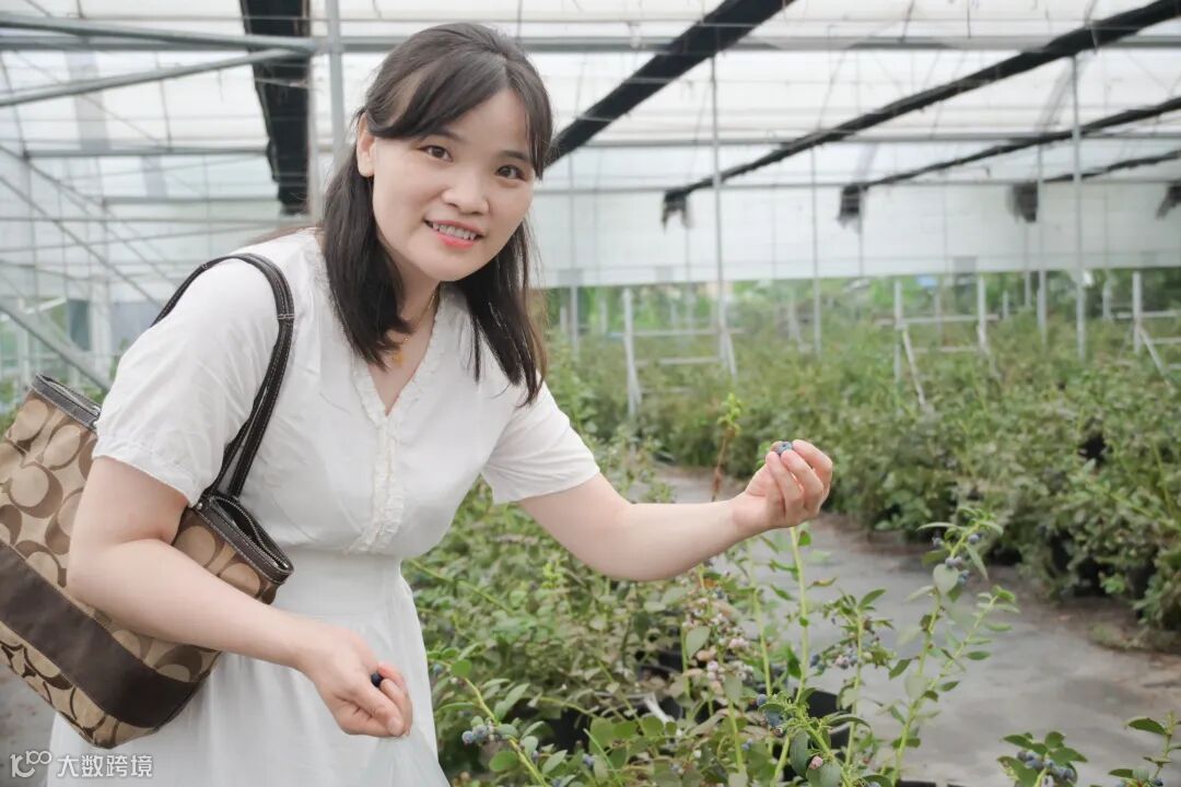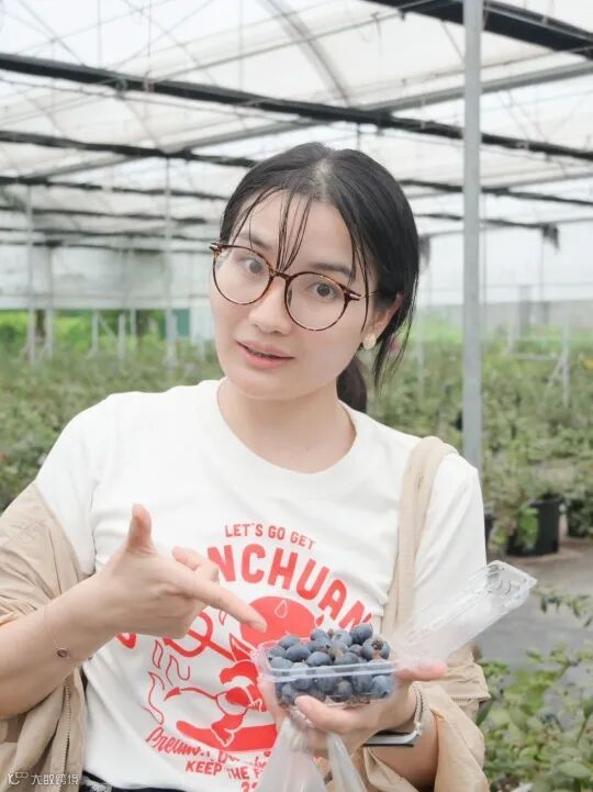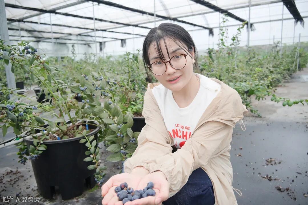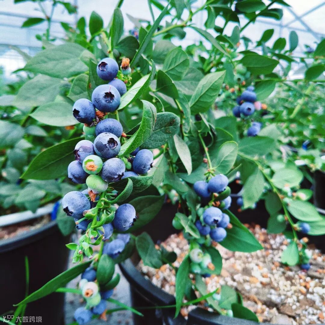 大棚内温暖湿润,蔬果的芬芳弥漫在空气中。一排排蓝莓树错落有致,饱满的蓝莓如紫宝石般挂满枝头。