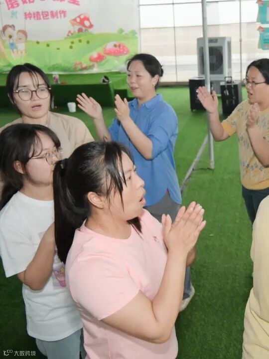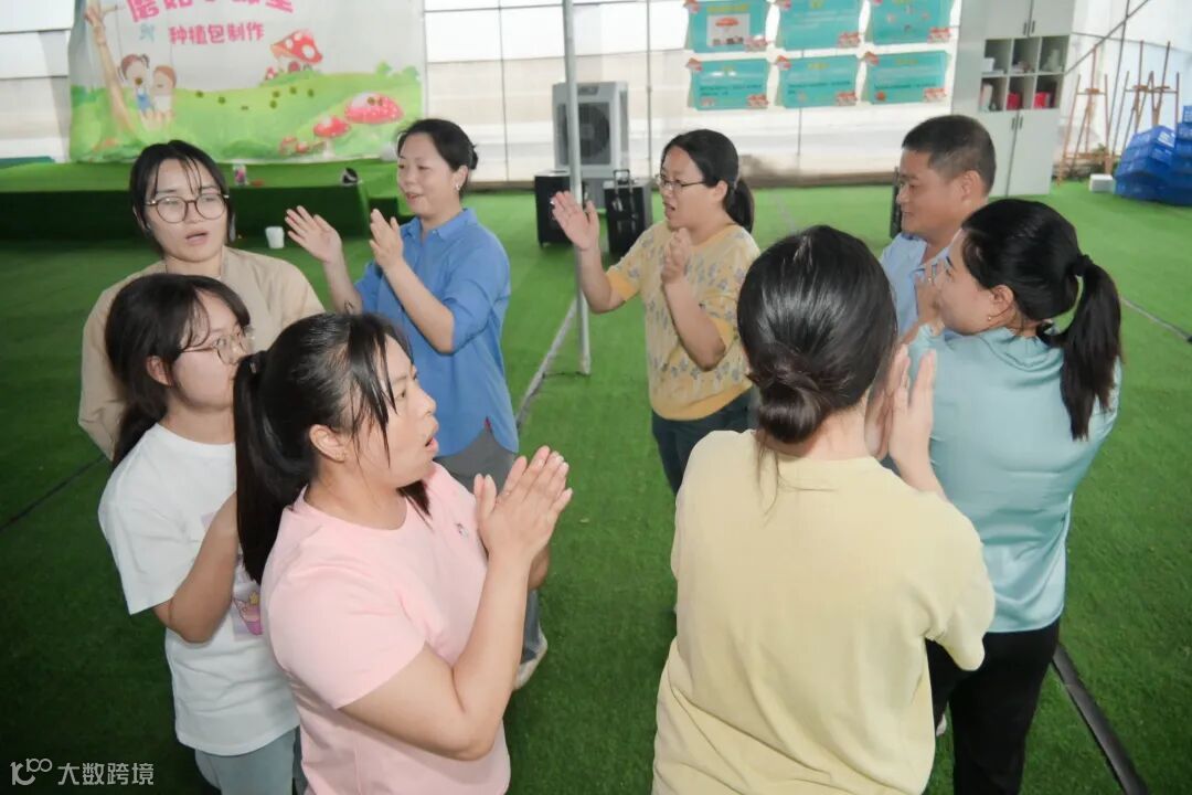 完成挑战后,大家整齐地一起蹲下5次,感受团队行动一致的力量。最后,大家互相拍着肩膀,从“1,拍一下肩膀,喊我”开始,节奏逐渐加快,声音越来越洪亮,直到喊出“我们是最棒的团队”,现场气氛被推向了顶点。