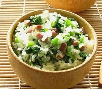 材料:米饭半斤,鸡蛋两个,香葱三根,猪肉一两,火腿一两,胡罗卜半两,水发香菇半两,海米半两,包菜一两,盐、鸡汤、猪油、味精、胡椒粉、酱油。