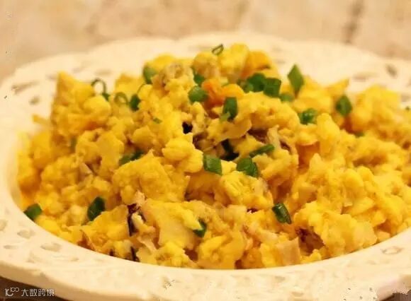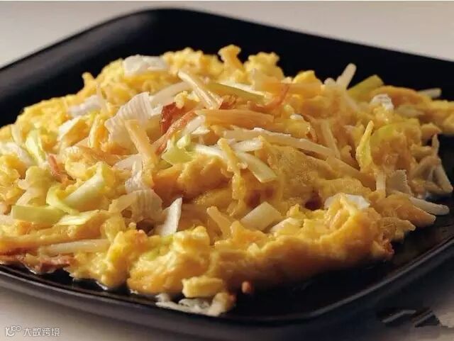 3.把混合液分成两份,每份用2汤匙油炒熟上盘,倒入适量酱油、香油即可。炒蛋时,注意油要热;若想火腿香一点,可与洋葱粒一起先炒。