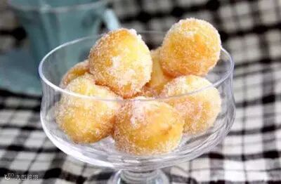 2.油锅烧至三成热,改用小火,将蛋糊做成丸子逐个放入锅中,轻轻搅拌,待蛋球浮上油面,变成淡黄色时捞出滤干油待用。