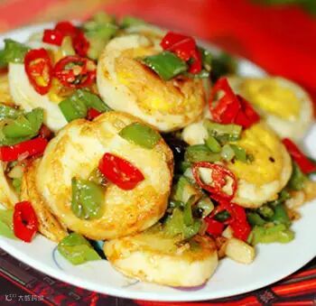 ③炒锅中热油爆香豆豉、辣椒、蒜末;放入子姜末、加少许食盐,将荷包蛋片放入菜锅同炒;