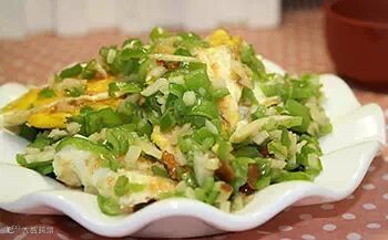 ④将煎蛋、青椒、朝天椒倒入翻炒,加适量的盐、糖,出锅前淋生抽,再翻炒一分钟即可。