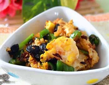 ③将锅倾斜,沥出油,加热,下豆豉和线椒爆香,将炒好的荷包蛋和配料一起翻炒均匀;