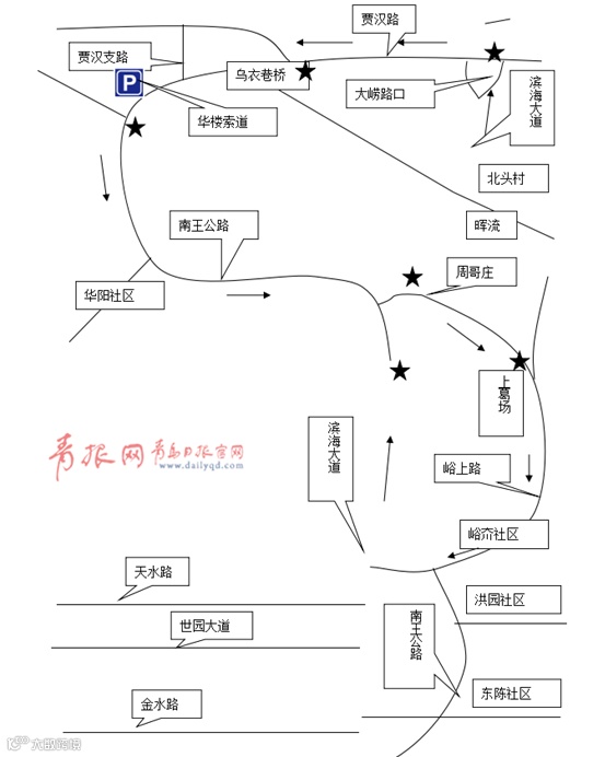 (四)贾汉路从城阳方向驶来的车辆,到贾汉支路路口禁止直行,只允许右转进入贾汉支路。贾汉路(乌衣巷桥至贾汉支路)只允许车辆自东向西行驶;