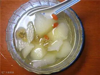 食材:雪梨50g,枸杞2g,菊花2g,冰糖适量