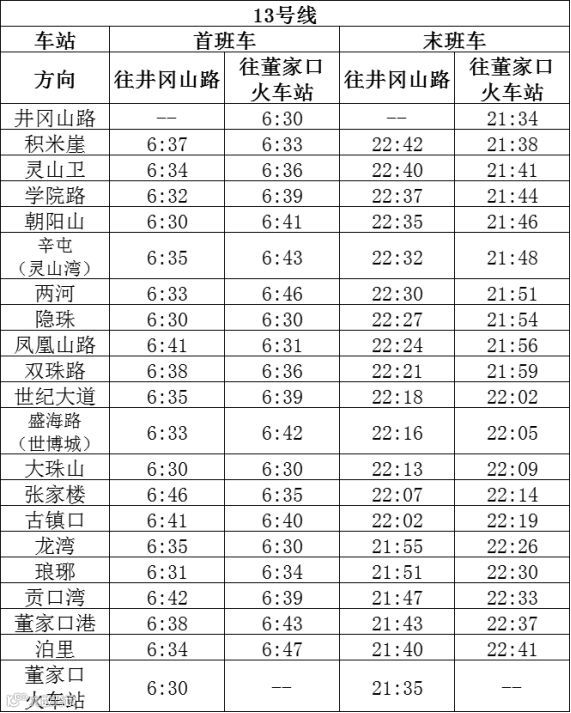 △ 11、13号线工作日早晚高峰时段列车恢复大小交路运行,小交路分别为苗岭路站至博览中心站、井冈山路站至大珠山站,行车间隔压缩至约8分20秒;大交路区段分别为博览中心站至钱谷山站、大珠山站至董家口火车站,行车间隔压缩至约16分40秒,平峰仍按单一大交路运行,行车间隔约16分40秒。各线路周末行车安排不做调整,2、3、11、13号线首班车时间恢复至疫情前安排。