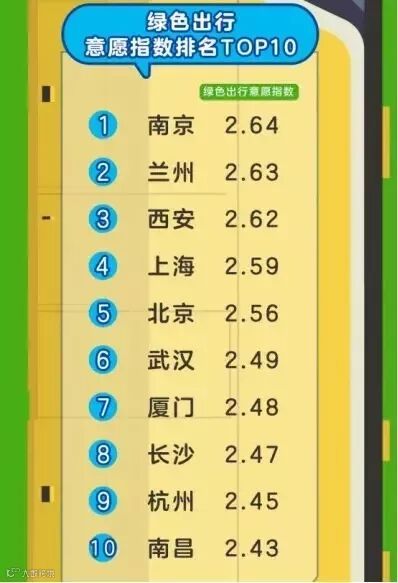 其中,排名第一的是南京,公交/地铁、骑行、步行出行意愿指数最高,尤其是骑行出行意愿指数相比其他两项表现较好。兰州、西安、上海、北京、武汉、厦门、长沙、杭州、南昌依次排名前十,南方城市占7成。